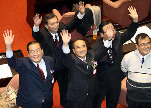 臺(tái)灣地區(qū)第七屆“立法院”二月一日選舉“立法院長”,中國國民黨籍“立委”王金平(前左二),以85票對(duì)27票打敗對(duì)手,確定連任“立法院長”,中國國民黨籍“立委”曾永權(quán)(前左一)則高票當(dāng)選“副院長”。(“中央社”圖;郭日曉攝)