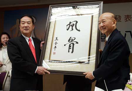 曾擔(dān)任高雄縣長(zhǎng)九年半的林淵源,口述“風(fēng)骨─林淵源八十談往”一書(shū)二月二十五日出版,前“臺(tái)灣省省長(zhǎng)”宋楚瑜(左)代表臺(tái)“立法院長(zhǎng)”王金平獻(xiàn)上風(fēng)骨提字,以表祝賀之意。(“中央社”圖;孫仲達(dá)攝)