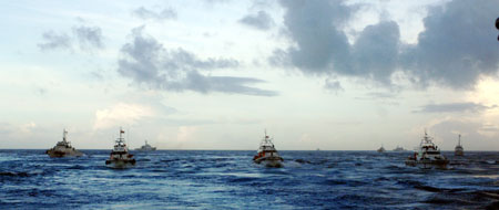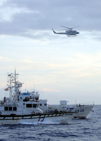 臺灣保釣人士以海釣船前往釣魚島宣示“主權(quán)”,十六日清晨當(dāng)保釣船只接近釣魚島海域時(shí),臺灣巡防艇(前)與日本保安廳巡邏艇(后)相互對峙,不讓日本船只接近保釣船,空中還有日本直升機(jī)沿途監(jiān)視。整個(gè)釣魚島海域布滿雙方海防艦艇,情形緊張中相互又頗節(jié)制。“中央社”圖