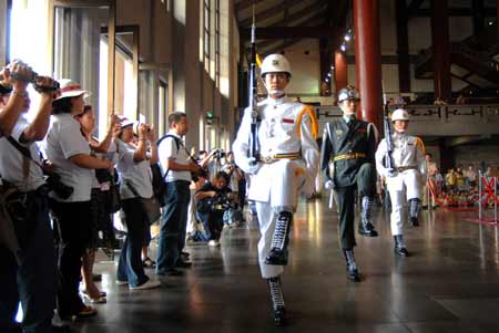 兩岸周末包機(jī)四日啟動,廣州首發(fā)旅游團(tuán)抵臺后即前往臺北“國父紀(jì)念館”參觀,正好看到三軍儀隊(duì)表演,感到很興奮,手中相機(jī)拍不停。