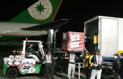 圖:贈臺大熊貓"團團""圓圓"抵達臺北桃園機場