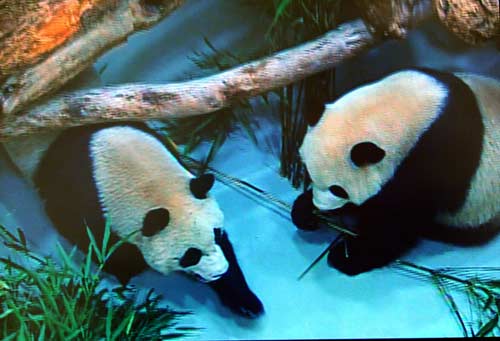 大陸贈(zèng)臺(tái)大熊貓“團(tuán)團(tuán)”(右)“圓圓”23日晚間抵達(dá)新家臺(tái)北市立動(dòng)物園,經(jīng)過半小時(shí)的適應(yīng),晚間八時(shí)過后由“團(tuán)團(tuán)”開始在臺(tái)灣的第一次進(jìn)食。