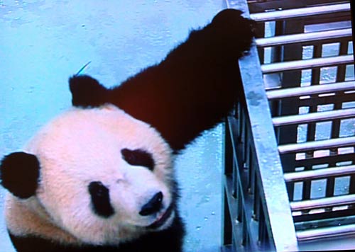 熊貓好奇地爬上鐵籠,四處觀察園內(nèi)的各項(xiàng)設(shè)施!爸醒肷纭眻D