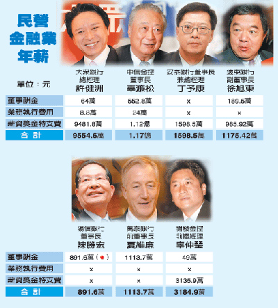 依已公告薪酬的金融機(jī)構(gòu)年報(bào),中信金董事長辜濂松全年合計(jì)領(lǐng)取1.17億元最多,許健洲全年薪酬9,554萬元名列第二。第三名是安泰銀董事長丁予康的1,598萬元,但丁予康同時(shí)兼任安泰銀總經(jīng)理,一人身差二職才領(lǐng)取逾千萬元年薪。