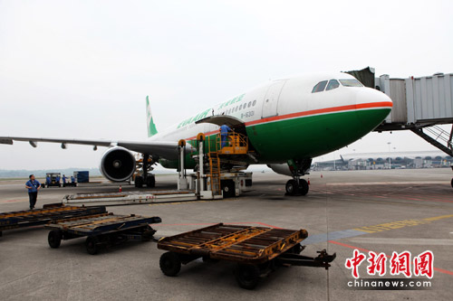 中新網(wǎng)重慶5月26日電 (記者 郭晉嘉)隨著富士康、英業(yè)達(dá)等臺企入駐重慶,今年以來渝臺直航航線客運持續(xù)火爆,貨運開始升溫。5月26日,臺灣立榮航空的B7192航班由麥道90機型改為252座的空客330機型執(zhí)飛,這是重慶—臺灣航線首次采用大型寬體機,也是首次大批運送貨物。