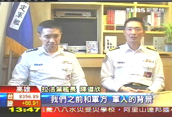 中新網(wǎng)1月15日電 據(jù)TVBS報道,臺灣海軍一級巡防艦艇“拉法葉艦”,有一對同時服役的艦長是兄弟倆,創(chuàng)下臺灣海軍史上的紀錄。現(xiàn)年43歲的陳道欣和他的弟弟,41歲的陳道輝,先后加入海軍,哥哥在2008年9月當(dāng)上艦長,而弟弟3個月后,在同年12月也當(dāng)上艦長。