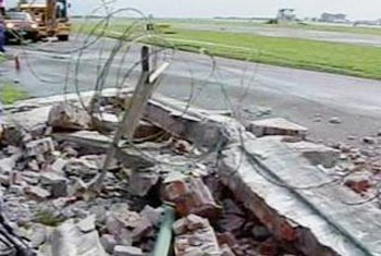 這輛拖掛車車頭撞得扭曲變形,還把圍墻撞下一大塊,更讓人緊張的是,它撞壞的是花蓮空軍基地的外墻,目前“漢光”演習正在進行,軍用飛機全讓外界看光。