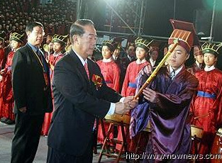 中新網(wǎng)9月27日電 2009年第二屆中華文化快車兩岸師生聯(lián)合祭孔大典今日上午在新竹隆重登場,祭孔大典更開創(chuàng)先例,透過因特網(wǎng)同步同時在新竹、北京、山東三地聯(lián)合進(jìn)行,萬余名兩岸師生共同參與。親民黨主席宋楚瑜更第二度應(yīng)邀擔(dān)任祭孔大典正獻(xiàn)人,這也是近60年以來,臺灣民間祭孔規(guī)模最大的一次集會。