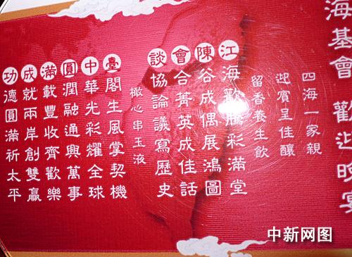 ;鶗䴙橥硌缣刂埔环荨安仡^詩”菜單:“江海歡騰彩滿堂/陳谷成偶展鴻圖/會合精英成佳話/談協(xié)論議寫歷史/臺閣生風(fēng)掌契機/中華光彩耀全球/圓潤融通興萬事/滿載豐收齊歡樂/成就兩岸創(chuàng)雙贏/功德圓滿祈太平”,以每句詩的頭一個字組成“江陳會談.臺中圓滿成功”。