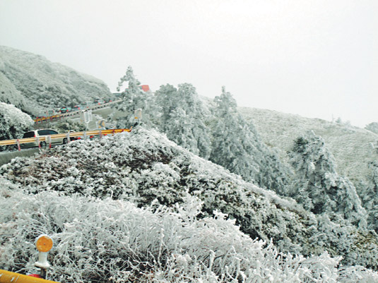 “哇!好漂亮,松樹(shù)被寒霜雕成冰晶,是野外自然的圣誕樹(shù)”、“鐵杉一身雪白,造形很美”,逾萬(wàn)游客在昆陽(yáng)至武嶺路段不斷贊美銀白世界。