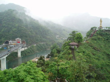 大約10分鐘,就爬上了觀音臺(tái)。觀音臺(tái)立有一座四十尺高,以青銅鑄造的觀音圣像,下方另一平臺(tái),有一圓頂?shù)牡钐,祀奉觀音神像。觀音臺(tái)上,居高臨下,眺望遠(yuǎn)近山水,俯瞰坪林聚落,景色怡人。觀音臺(tái)步道沿途亦無(wú)遮蔭,陰涼天氣或雨中來(lái)訪皆宜,惟不宜艷陽(yáng)高照日。