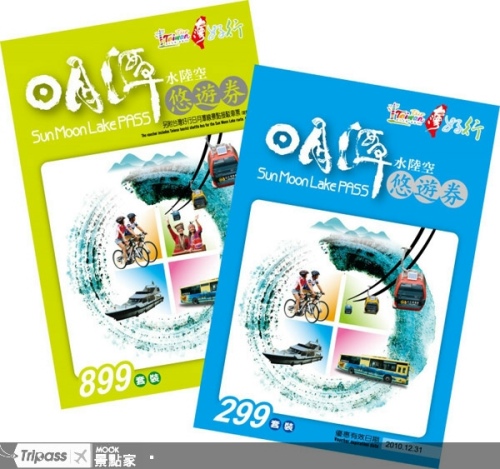 日月潭水陸空悠游券分為299元藍(lán)色套裝6合1優(yōu)惠,包括纜車票、水社到伊達(dá)邵船票(單趟)、環(huán)潭巴士1日票、捷安特單車1小時免費(fèi)體驗(yàn)券,和電動車租車8折券,游客到寺廟蓋紀(jì)念章,還可以兌換日月潭的獨(dú)特紀(jì)念品。若是需要臺中至日月潭交通接駁的游客,可選擇899元的綠券,除了藍(lán)券優(yōu)惠外,再包含臺中至日月潭的臺灣好行景點(diǎn)接駁來回票,以及九族文化村門票。