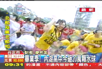 中新網(wǎng)5月20日電 據(jù)臺(tái)灣TVBS報(bào)道,每年一到畢業(yè)季,最引人注目的就是內(nèi)湖高中傳統(tǒng)的砸水球,今年學(xué)生們準(zhǔn)備了20萬顆水球,歌手郭采潔也來獻(xiàn)唱,現(xiàn)場(chǎng)好不熱鬧。