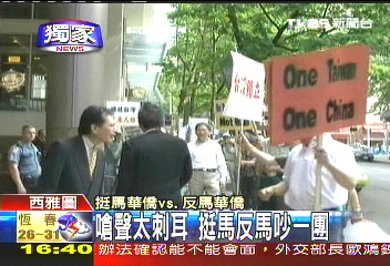 而飯店里的挺馬僑胞也不停在喊支持口號(hào),才讓馬英九開心地笑了,挺馬僑胞的歡呼聲一時(shí)間蓋過了場外的嗆聲。而反馬僑胞仍舊拼命表演,手上高舉“ONE TAIWAN ONE CHINA”的“臺(tái)獨(dú)”標(biāo)語,徹底惹毛了飯店2樓的挺馬僑胞,忍不住沖下了樓,戰(zhàn)火一觸即發(fā)。