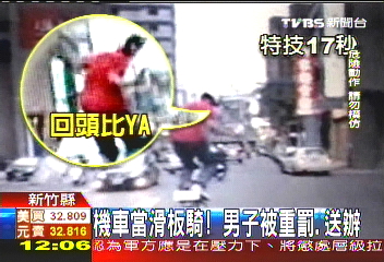 中新網(wǎng)7月23日電 據(jù)臺灣TVBS報道,新竹一名男子在車流量很高的市區(qū),騎車耍特技,把摩托車當(dāng)滑板,雙腳站在坐墊上,時速50公里前進(jìn),雖然才17秒鐘,但看起來險象環(huán)生。