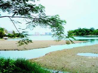 澄清湖因高屏溪原水濁度太高,且攔河堰抽水設(shè)備受損,已十天無法進(jìn)水。水位從滿水位銳降至十六點(diǎn)五米呆水位,有效蓄水量僅剩四十多萬公噸,水庫處處可見裸露底泥的大片沙洲。