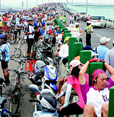 縣政府原計劃將無車日活動設在板橋文化路的捷運新埔站,要車友在這里集結(jié)上橋,后來報名參加車友實在太多,昨天緊急調(diào)整通車典禮會場至臺64線道路的16.3公里處,也就是五股交流道附近。沒想到清晨4時起就有車友成群結(jié)隊上橋,卻在16.3公里處被擋駕,他們耐心等候7時30分通車典禮,沒想到因人太多,近七萬車友和愛車就硬被堵在高架橋上。