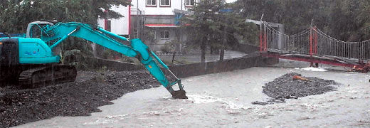 災情最嚴重的是冬山鄉(xiāng)的太和村,上游的十三份溪在上次芭瑪臺風來襲時,溪里大量土石淤積,還來不及全部清除,這次又逢大雨,溪水暴漲淹到路面,多條農(nóng)路封閉?h府工務處緊急出動3臺挖土機疏浚十三份溪,避免溪水的水位持續(xù)升高,造成更嚴重的災情。