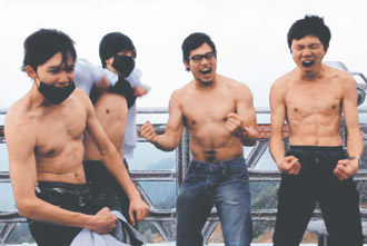 學(xué)生們在景觀臺上一字排開,女同學(xué)一聲令下,有3人先脫掉上衣,露出結(jié)實的肌肉,但第4人僅做象征性的配合,將胸前的衣服拉高,臉部還戴著口罩,遭到女同學(xué)大聲糾正。