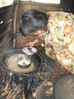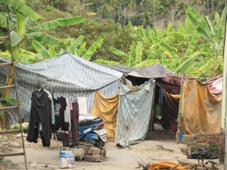 簡(jiǎn)陋破落帳篷搭在香蕉園里,卓姓夫妻與兒子擠在不到兩坪的空間里;室內(nèi)堆放著臟亂衣物等用品,睡覺(jué)的地方用木板稍隔開(kāi),陳設(shè)比起工寮還要簡(jiǎn)陋。緊鄰廚房?jī)H有一只燒柴鍋?zhàn)樱考遗魅隋佔(zhàn)诱谡舻,蒸蛋的水暗沉,她說(shuō):“這是早餐。”