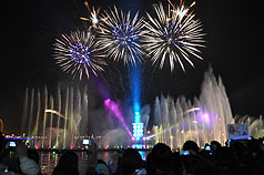中新網(wǎng)2月21日電 據(jù)“中央社”報(bào)道,2010高雄燈會(huì)藝術(shù)節(jié)20日晚登場(chǎng),由蕭萬(wàn)長(zhǎng)與高雄市長(zhǎng)陳菊共同點(diǎn)燈,海上主燈“高雄福虎”搭配水舞、雷射與高空煙火的聲光效果,絢爛奪目,前來(lái)觀賞民眾,萬(wàn)頭攢動(dòng)。
