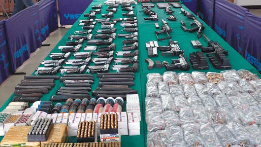 警方說,共起出39支手槍、15支沖鋒槍、一支散彈槍、兩組槍榴彈發(fā)射器、卡賓槍一支及子彈18340發(fā)。