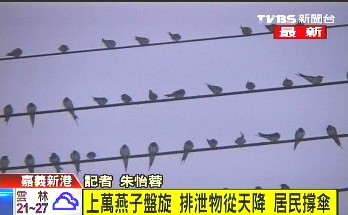 中新網(wǎng)4月6日電 據(jù)臺灣TVBS報道,嘉義新港地區(qū)最近出現(xiàn)大批燕子聚集,昨天(5日)是清明節(jié),數(shù)量更超過5萬只,引起當(dāng)?shù)鼐用駠^。居民說燕子多好像是代表福氣來,不過排泄物卻讓他們很困擾,出門都要撐傘,以防被鳥屎擊中。