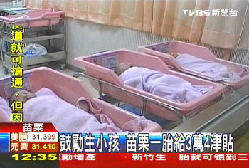 中新網(wǎng)4月29日電 據(jù)臺(tái)灣TVBS報(bào)道,為解決臺(tái)灣低生育率,島內(nèi)各縣市府均用獎(jiǎng)金吸引生小孩,例如新竹,生一胎就可以馬上領(lǐng)到3萬元(新臺(tái)幣,下同)補(bǔ)助,苗栗縣府過去生育津貼是3000元,現(xiàn)在提高10倍,變成生一胎就能領(lǐng)到3.4萬元,但得分成4年領(lǐng),苗栗縣現(xiàn)在人口數(shù)56萬,希望提出重賞后,新生兒人口數(shù)能夠增加10%,也就是1年從大約4950人,增加到5445人。