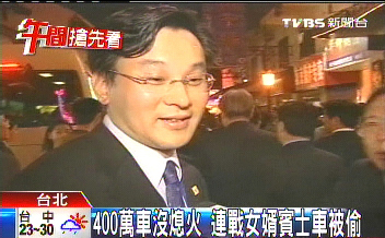 中新網(wǎng)5月1日電 據(jù)臺灣TVBS報道,國民黨榮譽主席連戰(zhàn)的女婿、連惠心丈夫陳弘元的奔馳車被偷,消息也登上新聞版面。陳弘元是和妹妹到新竹拜訪易經(jīng)老師,司機趁空檔,到超商繳費而沒熄火的時候,原價400多萬的奔馳車,被歹徒乘機偷開走。