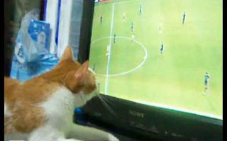 中新網(wǎng)6月22日電 據(jù)臺(tái)灣“今日新聞”報(bào)道,2010世界杯足球賽不僅是全球人們關(guān)注的焦點(diǎn),連貓咪也喜歡,據(jù)了解,臺(tái)灣一只名叫加菲(GARFIELD)的貓咪,竟然緊貼在電視機(jī)前,無(wú)比專注地盯著轉(zhuǎn)播,還會(huì)激動(dòng)地伸出貓爪,對(duì)著熒幕又拍又打。