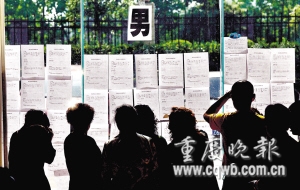 114號(hào)男士的資料顯示:28歲,身高1.78米,重大建筑系碩士畢業(yè),目前在江北區(qū)一事業(yè)單位做設(shè)計(jì)工作。母親張女士身旁坐了8位父母,排隊(duì)和她交談!拔遗畠涸谥貞c師范大學(xué)讀研究生,單位委培,長(zhǎng)得也秀氣!薄拔遗畠阂膊诲e(cuò),西南財(cái)大畢業(yè),在建行上班”……幾位媽媽相互比拼,張女士連忙拿出筆記本一一記下他們的電話,說:“條件都好,我們當(dāng)父母的只是搭橋,讓兒女們自己選吧!