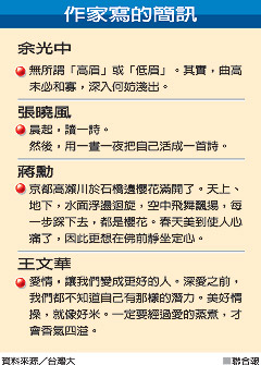 較少發(fā)短信的作家張曉風(fēng),昨天特別用短詩“用一晝一夜把自己活成一首詩”,示范短信該有的“簡潔卻深刻”,王文華贊美張曉風(fēng),生活俯拾都是詩,但多數(shù)人“把自己活成尸”,再次引來滿堂笑聲。