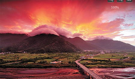 宜蘭南澳小學(xué)老師蔡沛旻昨清晨5時(shí)許,拍到南澳山區(qū)滿山火云,染成血紅的山頭向蒼穹激射出萬(wàn)道紅光,仿佛火山爆發(fā)漫山熊熊烈火、又似盤古開天的氣勢(shì),加上云彩翻山越嶺,氣勢(shì)壯麗磅礡,美妙的天象只維持5分鐘,已讓人驚嘆不已。