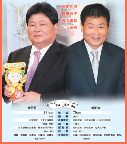 他說,“阿標(biāo)減肥秘方”是“運(yùn)動(dòng)加倍、食量減半、意志要強(qiáng)、決心要夠”四句箴言,愿獻(xiàn)給全臺(tái)的胖哥、胖嫂。