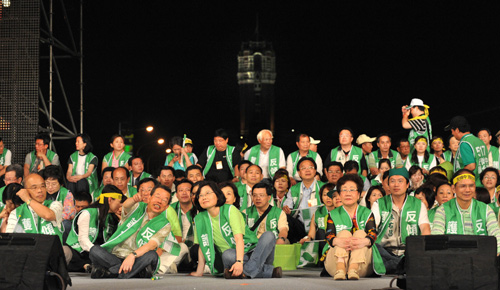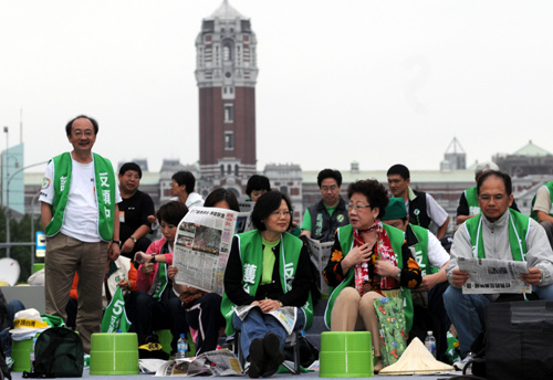 凌晨靜坐民眾逐漸散去,至上午仍在凱道群眾大約剩上千人,主舞臺區(qū)有民進(jìn)黨主席蔡英文、呂秀蓮、前“行政院長”謝長廷、蘇貞昌等人。