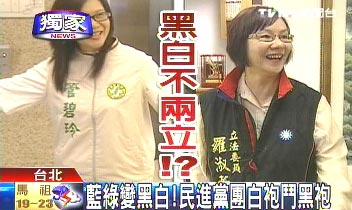 報道稱,“立法院”議場內(nèi),“立委”穿得花花綠綠難分你我,以后在議場對決,都穿戰(zhàn)袍的話就會變成“黑白分明”,國民黨黑、民進黨白,對綠營有無形的加分效果;不過,國民黨“立委”卻說一幫人穿得這么白,實在不吉祥。