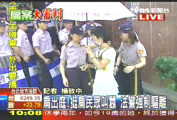 部分陳水扁支持者提出抗議,因?yàn)榕月牭拿~有限,支持者被擋在外面,不能進(jìn)去旁聽,因此不斷叫囂,高喊著“沒有天理”等話語,一度和法警發(fā)生推擠、爭吵,但隨即遭到法警強(qiáng)制驅(qū)離。