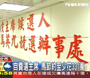 馬英九這回競(jìng)選黨主席全花私人存款,包括付給黨中央的作業(yè)費(fèi)200萬,70多坪辦公室約40天的租金17萬元,競(jìng)選活動(dòng)14天,下鄉(xiāng)的油料費(fèi)約84萬,文宣以及團(tuán)隊(duì)下鄉(xiāng)的交通費(fèi)、雜支,這回競(jìng)選最少331萬元。