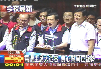 中新網7月22日電 據臺灣TVBS報道,馬英九參選國民黨主席,21日晚在臺北縣開講,馬英九花了相當大篇幅贊揚縣長周錫瑋,還調侃民進黨明年參選新北市呼聲很高的蘇貞昌,讓這場政見會,看起來反而像準主席拉抬周錫瑋的輔選大會。