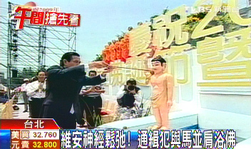 當時情景是:觀禮臺上,馬英九就坐在佛祖香案左手邊第一個位置,通緝犯林松輝“以中華理教總會”理事長名義大剌剌坐在香案另一頭,和馬英九相隔僅僅10米。