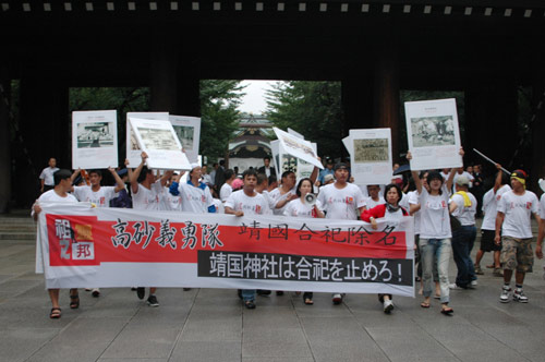 “還我祖靈隊(duì)”接著在大廣場上高歌“安魂曲”、吊祭早年被強(qiáng)迫合祀于靖國神社的祖先。他們在廣場停留近30分鐘后列隊(duì)步出靖國神社正殿,搭車離開現(xiàn)場。