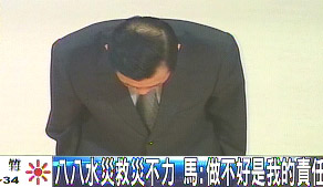 馬英九今日下午率領(lǐng)包括蕭萬(wàn)長(zhǎng)、“行政院副院長(zhǎng)”邱正雄等人,向媒體強(qiáng)調(diào)救災(zāi)決心,馬英九也率領(lǐng)全體與會(huì)官員向民眾180度鞠躬致歉,長(zhǎng)達(dá)十秒鐘之久。