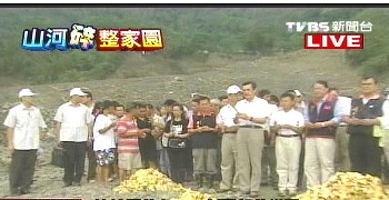 而馬英九到了遭土石掩埋的新開(kāi)部落,也在當(dāng)?shù)胤傧慵腊萃稣撸袂槟;在進(jìn)入新開(kāi)部落前,會(huì)經(jīng)過(guò)日前災(zāi)民立牌寫(xiě)著“32人死亡,SOS”的新寶橋,因?yàn)闃驍嗔耍┕挝幌仍诤哟蹭伾媳愕,讓?chē)子可以通過(guò)。
