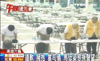 馬英九開口說話前先道歉,鞠躬足足有12秒。不但自己身兼數(shù)職,還擔(dān)任司儀,到了新開部落,還和災(zāi)民蹲在地上一起燒紙錢;現(xiàn)在馬英九不只是握手,更不吝惜用擁抱來?yè)嵛繛?zāi)民的心,遇到鄉(xiāng)長(zhǎng)反應(yīng)災(zāi)情,馬英九一站就是好幾分鐘,聽得很仔細(xì)。除了道歉,馬英九更具體提出解決方案。