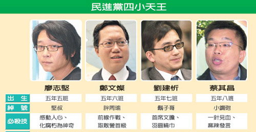 中新網(wǎng)12月14日電 在臺灣縣市長選戰(zhàn)結(jié)束后,深受民進(jìn)黨主席蔡英文倚重的“五年級F4”戰(zhàn)斗團(tuán)隊(duì)成形,民進(jìn)黨桃園縣長參選人鄭文燦、發(fā)言人蔡其昌、政策會首席副執(zhí)行長劉建忻、文宣部副主任廖志堅(jiān),儼然成為民進(jìn)黨的“四小天王”。