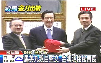 國民黨新舊秘書長交接儀式上,金溥聰從詹春柏與馬英九的手上接下印信,報道稱,這象征其扛下國民黨這部大機器的開始。