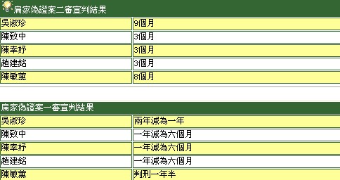 此前,臺(tái)北地方法院2009年9月1日依偽證罪判吳淑珍1年、陳致中、陳幸妤、趙建銘均為6個(gè)月。全案上訴高院后并于去年11月24日首次開庭。而當(dāng)日開庭不到30分鐘,吳淑珍、陳致中、陳幸妤、趙建銘4人都當(dāng)庭認(rèn)罪。