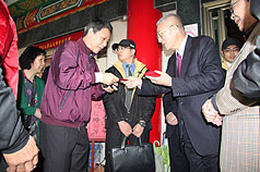 吳敦義在拈香祝禱期間,在大佛風景區(qū)內(nèi)的大雄寶殿廣場旁親自種下菩提樹,并發(fā)放888個福袋給前來游玩的民眾。