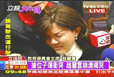 而上個(gè)星期才因?yàn)闆_突昏倒送醫(yī)的“主席”趙麗云,26日再度看到這樣混亂場面,一度痛哭!敖逃瘑T會(huì)主席”趙麗云:“我們要開會(huì),我們要按規(guī)則開會(huì),請所有的不管那個(gè)黨派的,要對得起人民,我們是拿薪水來開會(huì),不是來打架的!