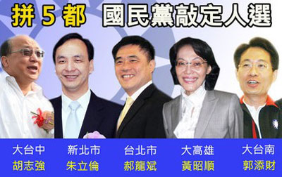 據(jù)悉,國(guó)民黨中央提名審核委員會(huì)于11日決定“五都”征召人選,國(guó)民黨秘書長(zhǎng)金溥聰宣布臺(tái)北市、新北市、大臺(tái)中、大臺(tái)南、大高雄分別征召臺(tái)北市長(zhǎng)郝龍斌、“行政院副院長(zhǎng)”朱立倫、臺(tái)中市長(zhǎng)胡志強(qiáng)、前“立委”郭添財(cái)、“立委”黃昭順代表國(guó)民黨參選。